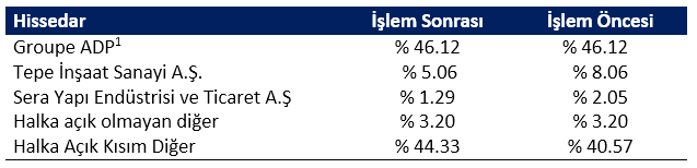 Satış sonrasında TAV Havalimanları Holding A.Ş.’de Tepe İnşaat Sanayi yüzde 5.06; Sera Yapı Endüstrisi ve Ticaret yüzde 1.29 paya sahip olacak. TAV Havalimanları’nın halka açıklık oranı ise yüzde 44.33’e yükselecek.