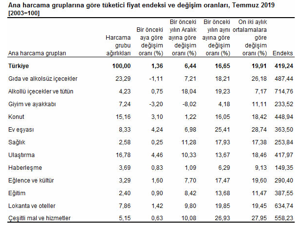 TÜFE'de (2003=100) 2019 yılı Temmuz ayında bir önceki aya göre %1,36, bir önceki yılın Aralık ayına göre %6,44, bir önceki yılın aynı ayına göre %16,65 ve on iki aylık ortalamalara göre %19,91 artış gerçekleşti.