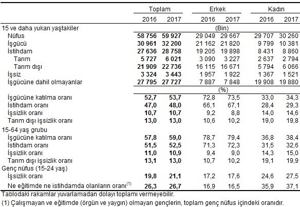 İşgücü 2017 yılı Temmuz döneminde bir önceki yılın aynı dönemine göre 1 milyon 239 bin kişi artarak 32 milyon 200 bin kişi, işgücüne katılma oranı ise 1 puan artarak yüzde 53.7 olarak gerçekleşti. Aynı dönemler için yapılan kıyaslamalara göre; erkeklerde işgücüne katılma oranı 0.7 puanlık artışla yüzde 73.5, kadınlarda ise 1.3 puanlık artışla yüzde 34.3 olarak gerçekleşti.