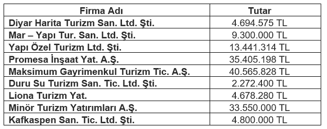 Yatırım teşvik belgeleri iptal edilen turizm firmalarının listesi şu şekilde: