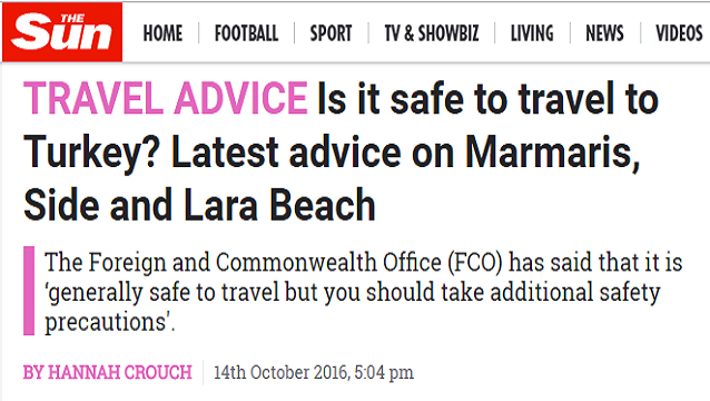 İngiliz Yabancılar ve Milletler Topluluğu Ofisi’nin (FCO): “15 Temmuz’da yaşanan darbe girişiminden sonra tansiyonun düştüğü, gerilimli durumun sakinleştiğini” belirttiği açıklamaya yer veren The Sun Gazetesi, yine de Şırnak, Mardin, Şanlıurfa, Gaziantep, Diyarbakır, Kilis ve Hatay illerine ve Suriye sınırına yakın olan Siirt, Tunceli ve Hakkari’ye gitmemeleri yönünde İngiliz turistleri uyardı. İngiliz Yabancılar ve Milletler Topluluğu Ofisi (FCO) genel olarak Türkiye’ye seyahat etmenin güvenli olduğunu fakat yine de bazı dönemlerde ilave güvenlik önlemlerinin alınması gerektiğinin, vatandaşlarının çevrelerindeki insanlara dikkat etmeleri ve kalabalık yerlerde fazla bulunmamaları yönünde uyarılarda bulundu.