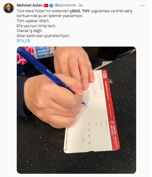 Öte yandan İYİ Partili Mehmet Aslan da sosyal medyadan tepki göstererek, “Türk Hava Yolları'nın sistemleri çöktü. THY uygulaması ve bilet satış kontuarında şu an işlemler yapılamıyor. Tüm uçaklar rötarlı. Elle yazılıyor biniş kartı. Olacak iş değil. Siber saldırıdan şüpheleniliyor” dedi.