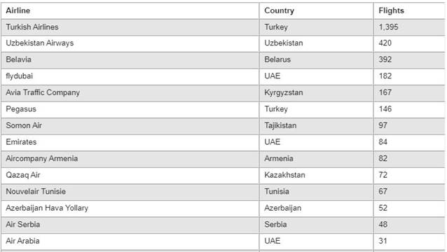 Yabancı ülkelere ait 30 havayolu şirketi Rusya operasyonlarına devam ederken listenin üst sıralarında THY ve Pegasus da yerini aldı.