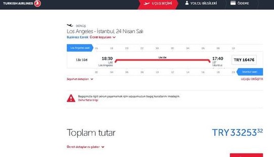 Talebinde etkisiyle 16 Nisan gidiş ve 24 Nisan dönüş olmak üzere business class sınıfında Los Angeles'a seyahat etmenin bedelinin 33.2 bin TL'ye kadar çıkması THY'nin bugüne kadar sattığı en pahalı bilet oldu.