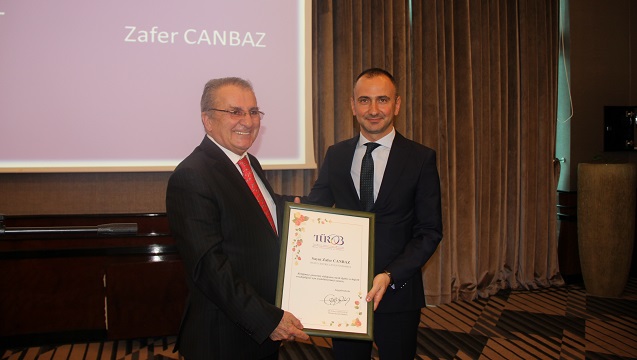 TÜROB Başkanı Timur Bayındır organizasyona ev sahipliği yapan Hyatt Centric Levent İstanbul Hotel Genel Müdürü Zafer Canbaz'a teşekkür plaketini sunarken