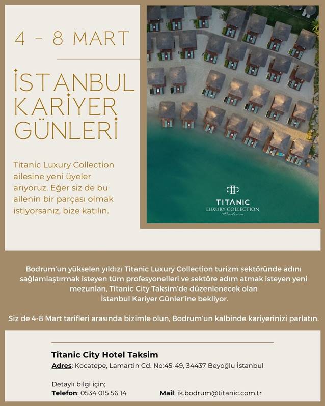 HaberlerEklenme Tarihi: 19.02.2024 12:13 Titanic Luxury Collection Bodrum’dan İstanbul’da kariyer günü Bodrum’un gözde otellerinden Titanic Luxury Collection Bodrum, 4-8 Mart 2024 tarihleri arasında İstanbul’da “Kariyer Günü” gerçekleştirecek. 0 Titanic Luxury Collection Bodrum, Titanic City Hotel Taksim’de düzenlenecek olan İstanbul Kariyer Günü’nde turizm profesyonelleri ile sektöre adım atmak isteyen yeni mezunları ağırlayacak. Titanic Kariyer Günleri Yorum yapmak için tıklayın Yorum Yap 0/500 Yorum yazma kurallarını okudum ve kabul ediyorum. Yorum Gönder Yorumlar (0) Daha fazla yorum yükle ÇOK OKUNANLAR Dalaman ve Bodrum uçuşlarında neler oluyor? TÜRSAB yanıtladı 1 İspanya’dan Türkiye hamlesi 2 Paşabahçe Cam Fabrikası arazisinin yeni sahibi Tahir Çelik oldu... 3 Turizmde yeni ceza dalgası: Kurallara uymayan ödeyecek 4 Formula 1 Türkiye’ye dönüyor: Tarih netleşti 5 Kavaloğlu: Antalya’ya pahalı diyen hadsizlere hadlerini bildireceğim… 6 70 yıllık turizm imparatorluğu satılıyor: Türkiye'nin en eski milli otelin yeni sahibi kim olacak? 7 Corendon Airlines yolcuları mangal lahmacunu sevdi 8 Ata Turizm’in dev sermaye kararı KAP’a bildirildi 9 Elite World INN İstanbul Mahmutbey için geri sayım başladı 0