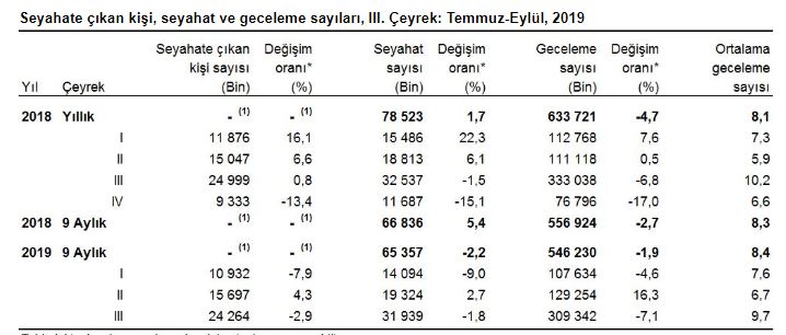 Temmuz, Ağustos ve Eylül aylarından oluşan III. çeyrekte, yurt içinde ikamet eden 24 milyon 264 bin kişi seyahate çıktı. Seyahate çıkanların bir ve daha fazla geceleme kaydı ile ülke içinde yaptıkları toplam seyahat sayısı bir önceki yılın aynı çeyreğine göre %1,8 azalarak 31 milyon 939 bin seyahat olarak gerçekleşti. Bu çeyrekte seyahate çıkanlar 309 milyon 342 bin geceleme yaptı. Ortalama geceleme sayısı 9,7 gece oldu.