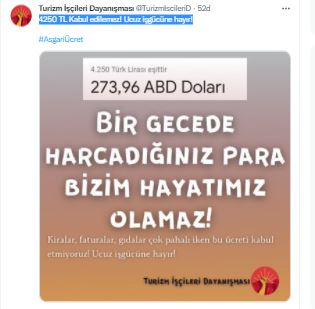 Yeni belirlenen asgari ücrete çeşitli kesimlerden farklı tepkiler geldi. Turizm İşçileri Dayanışması'nın sosyal medya hesabından yapılan açıklamada " 4250 TL Kabul edilemez! Ucuz işgücüne hayır!" ifadeleri kullanıldı. Açıklamada " Bir gecede harcadığınız para bizim hayatımız olamaz. Kiralar, faturalar, gıdalar çok pahalı iken bu ücreti kabul etmiyoruz. Ucuz işgücüne hayır" ifadeleri kullanıldı.