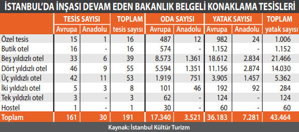 - İstanbul’daki otellerin doluluk oranı yüzde 49, oda fiyatlarında düşüşler yüzde 22 civarında. İnşaatı devam eden turistik tesislerin çokluğu ise hem doluluk oranının hem de fiyatların hemen toparlanamayacağına işaret ediyor. Kültür ve Turizm Bakanlığı verilerine göre İstanbul’da inşaatı devam eden bakanlık belgeli konaklama tesisi sayısı 191. İşletmede olanların sayısı ise 525. Yatak sayısı üzerinden gidersek durum daha netleşecek. İstanbul’daki yatak kapasitesi Ocak 2017 itibarıyla 103.742. 2016’da bu yatak kapasitesinin yarısı kullanılabildi, diğer yarısı boş kaldı.
