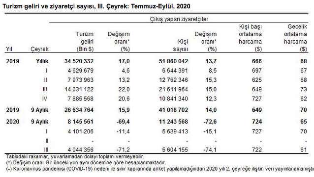 Türkiye İstatistik Kurumu (TÜİK) 2020 3. çeyrek turizm verilerini açıkladı. Turizm geliri Temmuz, Ağustos ve Eylül aylarından oluşan III. çeyrekte bir önceki yılın aynı çeyreğine göre %71,2 azalarak 4 milyar 44 milyon 356 bin $ oldu. Turizm gelirinin (cep telefonu dolaşım ve marina hizmet harcamaları hariç) %71,6'sı yabancı ziyaretçilerden, %28,4'ü ise yurt dışında ikamet eden vatandaş ziyaretçilerden elde edildi.