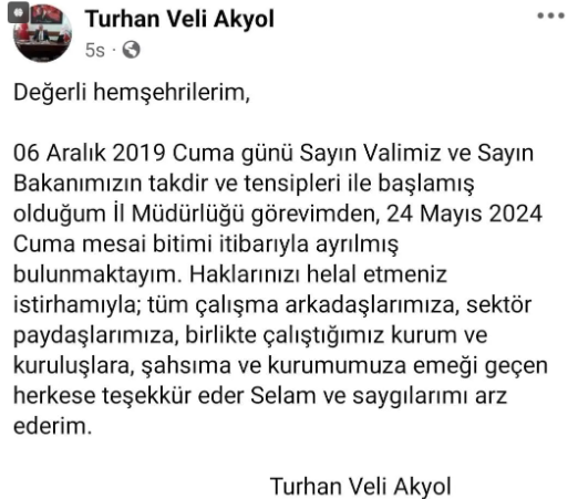 Denizli İl Kültür ve Turizm Müdürü Turhan Veli Akyol, sosyal medya üzerinden yaptığı paylaşımla görevinden ayrıldığını duyurdu. 4 yıl önce Denizli İl Kültür ve Turizm Müdürlüğü görevine atanan Turhan Veli Akyol, görevini bıraktığını sosyal medyadan açıkladı. Akyol kurum çalışanlarına ve kamuoyuna hitaben yayınladığı mesajda, bugün mesai bitimi itibariyle görevinden ayrıldığını belirtti. Akyol, paylaşımında şu ifadelere yer verdi: “Değerli hemşehrilerim, 06 Aralık 2019 Cuma günü Sayın Valimiz ve Sayın Bakanımızın takdir ve tensipleri ile başlamış olduğum İl Müdürlüğü görevimden, 24 Mayıs 2024 Cuma mesai bitimi itibarıyla ayrılmış bulunmaktayım. Haklarınızı helal etmeniz istirhamıyla; tüm çalışma arkadaşlarımıza, sektör paydaşlarımıza, birlikte çalıştığımız kurum ve kuruluşlara, şahsıma ve kurumumuza emeği geçen herkese teşekkür eder, selam ve saygılarımı arz ederim.”