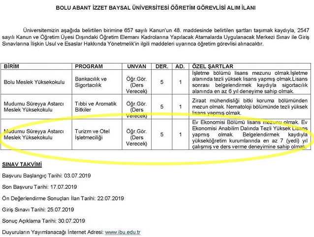 Bolu Abant İzzet Baysal Üniversitesi'ne bağlı Mudurnu Meslek Yüksekokulu’nda turizm ve otel işletmeciliği programı için “Ev Ekonomisi” lisanslı öğretim görevlisi ilanı verilmesi turizm akademisyenleri tarafından tepkiyle karşılandı. İlanın turizm eğitimi açısından “uygunsuz” olduğunu dile getiren Turizm Akademisyenleri Derneği Başkanı Prof. Dr. Muharrem Tuna, “Bu ilan turizm bölümleri açısından uygunsuz bir ilandır ve alınacak öğretim görevlisinin ilgili bölüme katkı sağlaması mümkün değildir” dedi.
