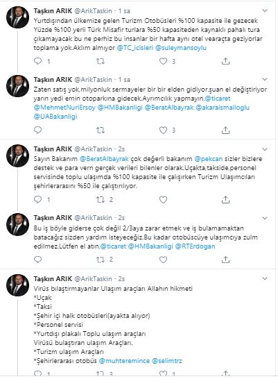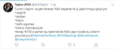 Taşkın Arık twitter hesabında da konuyu gündeme getirdi. Kültür ve Turizm Bakanı Mehmet Ersoy, Hazine ve Maliye Bakanı Berat Albayrak ve İçişleri Bakanı Süleyman Soylu'ya çağrı yapan Arık, Turizm araçlarının yüzde 50 kapasiteyle çalışmaya zorlandığını belirterek buna rağmen turizm araçlarının yüzde 18 vergi, otoban ve köprü geçiş ücretleri, trafik sigortası, koltuk mali mesuliyet sigortası gibi maliyet kalemlerini tam olarak ödemekle mükellef tutulduğunu belirtti. Arık " O zaman bu maliyet kalemlerini de yüzde 50 yapın" ifadelerini kullandı.