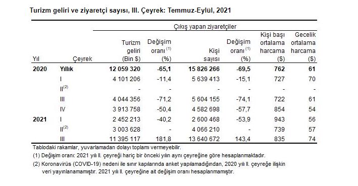 Türkiye İstatistik Kurumu(TÜİK) Temmuz, Ağustos ve Eylül aylarına ait 2021'in 3. çeyrek turizm geliri sonuçlarını açıkladı.