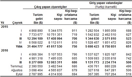 Ülkemizden çıkış yapan ziyaretçi sayısı 2016 yılı III. çeyreğinde bir önceki yılın aynı çeyreğine göre % 30.7 azalarak 12 milyon 63 bin 311 kişi oldu. Bunların % 78.5’ini (9 milyon 466 bin 509 kişi) yabancılar, % 21.5’ini (2 milyon 596 bin 802 kişi) ise yurt dışında ikamet eden vatandaşlar oluşturdu.