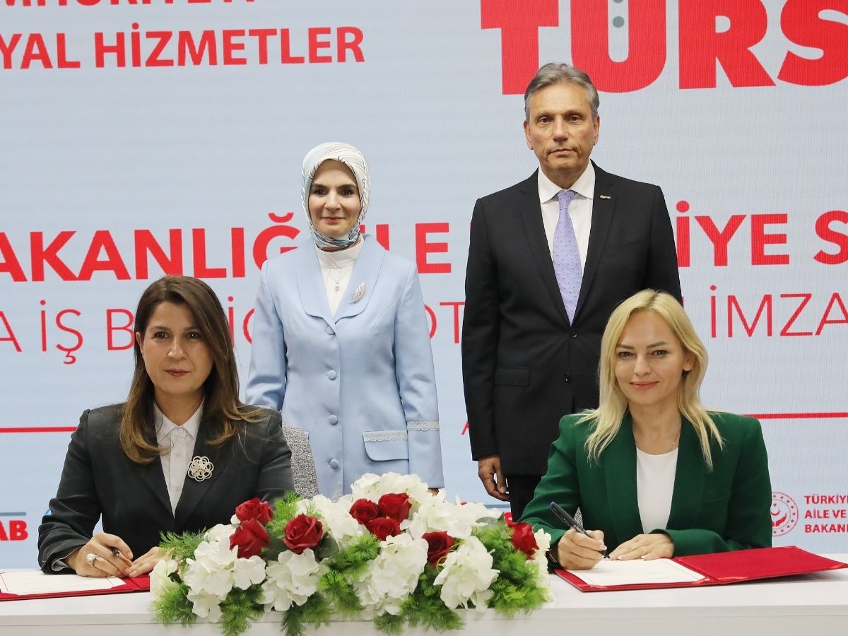 Türkiye Seyahat Acentaları Birliği’nin (TÜRSAB) turizm sektöründe kadın istihdamını artıracak adımlarına bir yenisi daha eklendi. Aile ve Sosyal Hizmetler Bakanlığı Kadının Statüsü Genel Müdürlüğü ile TÜRSAB arasında imzalanan iş birliği protokolünde, turizm sektöründe kadın istihdamının artırılması ve temsiliyetinin güçlendirilmesi hedefleniyor.Söz konusu iş birliği protokol toplantısına; Aile ve Sosyal Hizmetler Bakanı Mahinur Özdemir Göktaş, TÜRSAB Başkanı Firuz Bağlıkaya, Aile ve Sosyal Hizmetler Bakanlığı Kadının Statüsü Genel Müdürü Süreyya Erkan, TÜRSAB Başkan Yardımcısı Davut Günaydın, Yönetim Kurulu Üyeleri Esra Başeskioğlu, Oya Ebru Küçükel, Gökhan Ataseven, TÜRSAB Başkan Başdanışmanları Soner Bacaksız ve Öner Uygun, Orta Anadolu BTK Başkanı Muhammet Sarıtaş, Orta Anadolu BTK Üyesi Cevat Engin Şahin, TÜRSAB Hukuk Başdanışmanı İlker Ünsever, TÜRSAB Bilgi Teknolojileri Medya ve İletişim Grup Başkanı Mesut Kanat, bakanlık bürokratları, seyahat acentası temsilcileri ile basın mensupları katıldı.