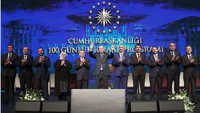 Cumhurbaşkanı Recep Tayyip Erdoğan hukûmetin 100 günlük icraat planını Cumhurbaşkanlığı Külliyesinde açıkladı.
