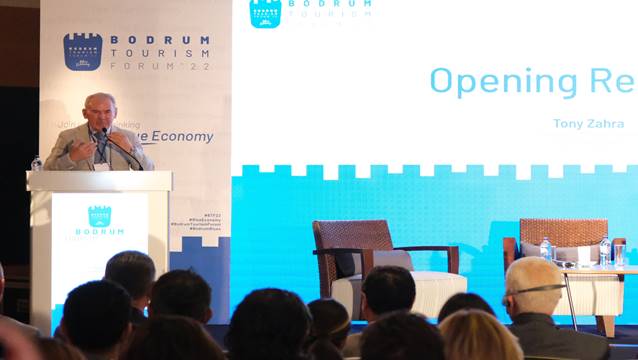 Bodrum Belediye Başkanı Ahmet Aras forumun açılışında yaptığı konuşmada her türlü çevre sorunuyla ilgili konuların kademeli iş birliği gerektirdiğine dikkat çekti. Aras şu ifadeleri kullandı: "Bizlerin ortak geleceğimiz için fırsatlar yaratmamız gerekiyor. Bodrum Turizm Forumu buna katkılar sağlayacaktır. Bodrum çok önemli bir turizm merkezi, coğrafi konumu nedeniyle insanlar Bodrum’a gelmek istiyor. Modern Akdeniz kimliği, açık fikirlilik ve yatırım için Bodrum çok güzel bir yer. Bodrum her zaman önemli bir buluşma noktası olmuştur. Kültürel değerlerimizle büyük bir potansiyele sahibiz. Pek çok kaynağımız var. Artan iklim krizi ve çevreyle ilgili sorunlar turistlerin seyahat tercihlerini etkilemeye başladı. O nedenle biz de stratejimizi mavi ekonomiye göre planlıyoruz. Daha dirençli ekosistemler oluşturmak konusunda çalışmalar yapılıyor. Yerel ekonomiyi geliştirmek ve yerel halkla bağlantılı bir perspektif geliştirmek, sürdürülebilirlik, göçün azaltılması gibi konularda uygulamalar hayata geçirmek amacındayız.