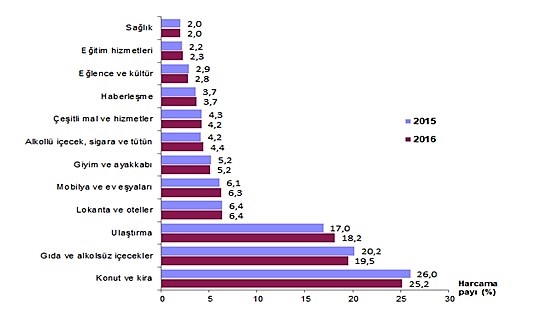 Giyim ve ayakkabı (% 5.2), sağlık (%2), haberleşme (% 3.7) ile lokanta ve otel (% 6.4) harcamalarının payı ise 2016 yılında da değişmedi.