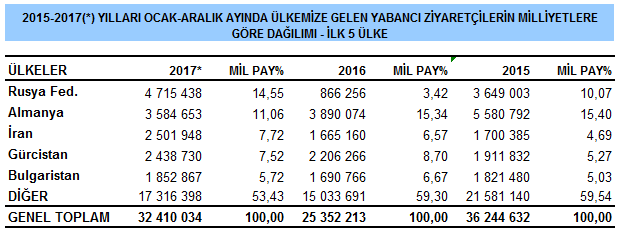 2017 yılı geneline bakıldığında en çok ziyaretçi gönderen ilk 5 ülke sıralamasında ise ilk sırada Rusya yer aldı.