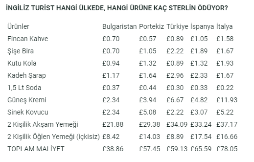 Söz konusu çalışmaya göre, İngiliz turistin kafe veya barda içeceği bir fincan kahve, 1 şişe bira, 1 kutu kola, 1 kadeh şarap, 1,5 litre soda, süpermarketten alacağı güneş kremi, sinek kovucu, 2 kişilik içkili akşam yemeği ve içkisiz 2 kişilik öğlen yemeğine ödeyeceği toplam maliyete göre en ucuz 5 ülke şöyle belirleniyor: Bulgaristan 38.86 sterlin, Portekiz 57.45, Türkiye 59.13, İspanya 65.59 ve İtalya ise 78.05 sterlin.