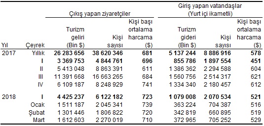 Türkiye'den çıkış yapan ziyaretçi sayısı 2018 yılı I. çeyreğinde bir önceki yılın aynı çeyreğine göre yüzde 26,4 artarak 6 milyon 122 bin kişi oldu. Bunların yüzde 80,2’sini 4 milyon 908 bin kişi ile yabancılar, yüzde 19,8’ini ise 1 milyon 213 bin kişi ile yurt dışında ikamet eden vatandaşlar oluşturdu.