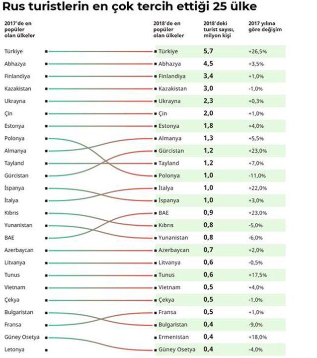 Rus turistlerin tatil için en çok tercih ettiği ülkeler belirlendi. Turstat kurumunun açıkladığı verilere göre, Türkiye iki yıldır üst üste ülke dışına çıkan Rus turistlerin en popüler tercihi konumunda. Sputnik, Rus vatandaşlarının en çok seyahat ettiği ülkelere dair bilgileri infografikte bir araya getirdi. İşte o tablo...