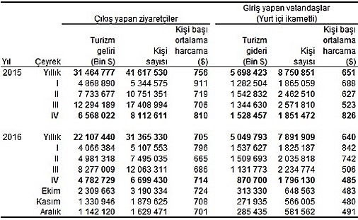 Türkiye İstatistik Kurumu’nun açıkladığı verilere göre turizm geliri 2016 yılının, Ekim, Kasım ve Aralık aylarından oluşan IV. çeyrekte bir önceki yılın aynı çeyreğine göre % 27.2 azalarak 4 milyar 782 milyon 729 bin $ oldu.