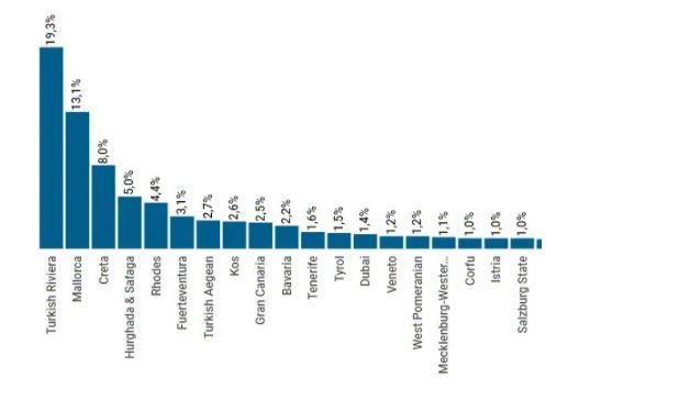 Almanların en çok seyahat ettiği turistik bölgeler içinde Türk Rivierası %19,3 ile ilk sırada yer alırken onu; %13,1 ile Mallorca, % 8 ile Girit ve %5 ile Hurghada & Safaga izledi. (Turizmdatabank)