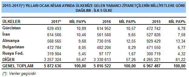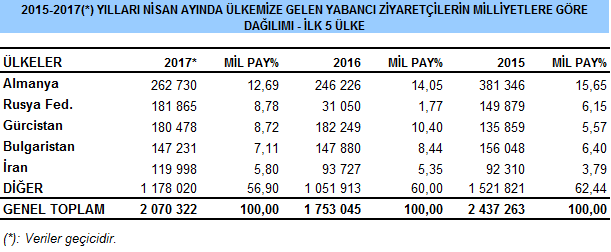 Nisan 2017 döneminde Türkiye'ye en çok ziyaretçi gönderen ülkeler, Almanya, Rusya, Gürcistan, Bulgaristan ve İran oldu.