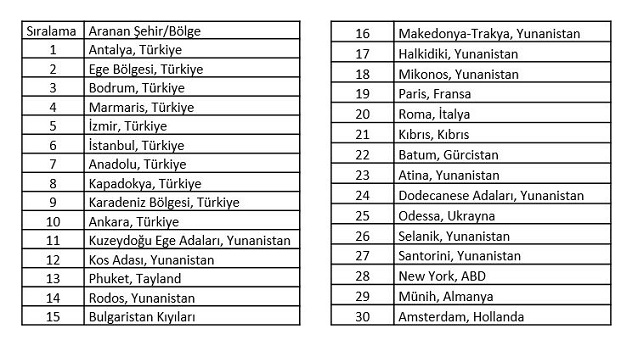 Türk seyahat severlerinin 1 Haziran - 31 Ağustos 2017 tarihleri arasında internet üzerinden yaptıkları aramalardan elde edilen verilerle hazırlanan ve ilk 30 destinasyonu sıralayan listede, ilk 10’da Türkiye’deki şehir ve bölgelerin sıralanması, yurt içi seyahatlerin hala popüler olduğunu gösterdi.