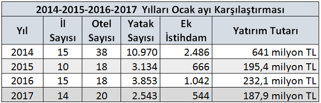 Öte yandan Ekonomi Bakanlığı verilerine göre, ocak ayında ülke genelinde toplamda 14 şehirde toplam yatırım bedeli 187.9 milyon TL olan 20 yeni otel projesinin teşvik belgesi, toplam 10,5 milyon TL yatırım tutarı olan 4 otelin ise yenileme belgesi aldı. Yatırım tutarı geçen yılın aynı ayına göre yüzde 19, proje sayısı yüzde 11 arttı. Geçen yılın aynı ayında 18 otel için 232.1 milyon TL’lik teşvik başvurusu yapılmıştı. Ocak 2017’de yapılan teşvik başvurularının sonuçlanmasıyla yatak kapasitesi 2.543 adet artacak. Ocak 2017’de yapılan başvularda yatak sayısı açısından 654 yatak İstanbul ilk sırada yer alırken, 354 yatak ile Trabzon ikinci ve 230 yatak ile Antalya üçüncü sırada yer aldı. İstanbul, yeni yatırım yapılacak tesis sayısı bakımından da 4 otel ile ilk sırada yer aldı. Teşvik belgesi alan oteller içerisinde 3 yıldızlı oteller 13 otel ilk sırada yer alırken, kapasite bakımında 1.148 yatak ile 4 yıldızlı oteller ilk sırayı aldı.