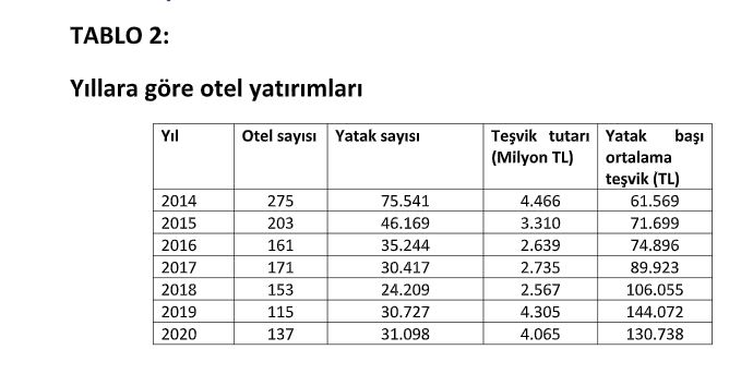 Türkiye Otelciler Birliği’nin (TÜROB), Sanayi ve Teknoloji Bakanlığı’nın ‘Yatırım Teşvik Belgeleri’ne ilişkin verilerinden hareketle hazırladığı 2020 yılı yatırım raporuna göre, geçen yıl toplam teşvik değeri 4 milyar 65 milyon TL olan toplam 31 bin 98 yataklı 137 otel projesi için teşvik başvurusu yapıldı.