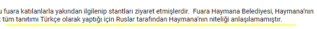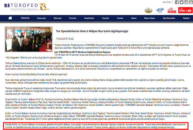 TÜROFED’in MITT Moskova 2018 Fuarı’na ilişkin değerlendirmelerin yer aldığı bu haberde, “Fuara Haymana Belediyesi, Haymana’nın turistik ve özellikle termal yönünü ön plana çıkaran bir stantla katılmış ancak tüm tanıtımı Türkçe olarak yaptığı için Ruslar tarafından Haymana’nın niteliği anlaşılamamıştır.” ibaresi yer aldı.