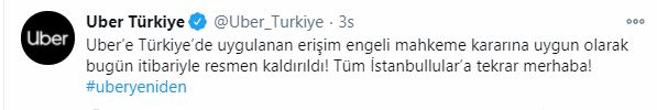 Uber Türkiye hesabından yapılan paylaşımda, "Uber’e Türkiye’de uygulanan erişim engeli mahkeme kararına uygun olarak bugün itibariyle resmen kaldırıldı! Tüm İstanbullulara tekrar merhaba" ifadelerine yer verildi.