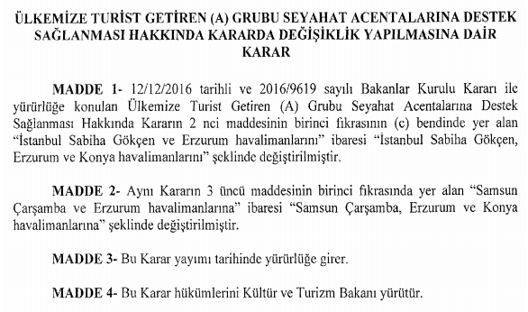 Daha önce alınan kararda adı geçen havalimanlarının yanı sıra Konya Havalimanına da tarifeli ve tarifesiz (charter) uçak seferleriyle 1 Ocak - 31 Aralık 2017 tarihlerinde turist getiren A Grubu seyahat acentelerine turistik uçak seferi başına 6 bin dolar destek sağlanacak.
