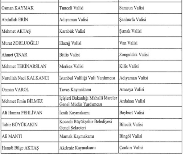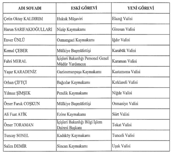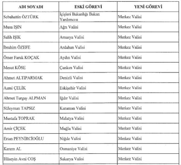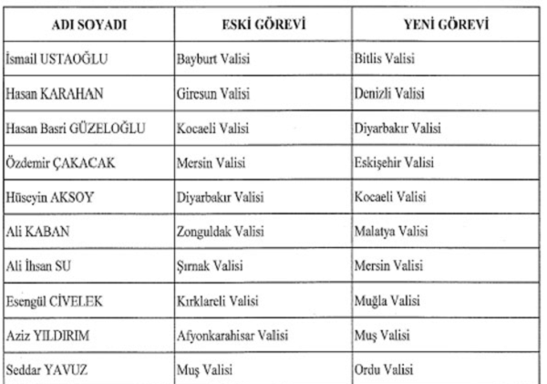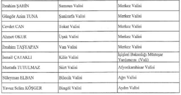 Kararnameye göre diğer vali atamaları şu şekilde: