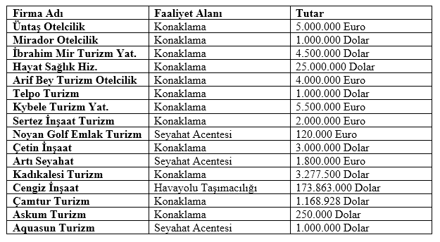 2017 yılının Mayıs ayında 16 turizm şirketine vergi, resim ve harç istisnası getirilirken, bu şirketler için öngörülen hizmet tutarı ise 214 milyon 59 bin Dolar ve 18 milyon 420 bin Euro olarak açıklandı.