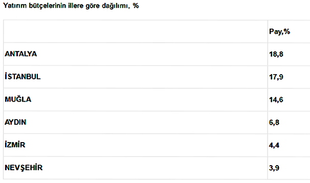 2016 yılının ilk 9 aylık verilere göre otel yatırım projeleri için ayrılan bütçe 3 ilde toplandı. Antalya’nın bütçeden aldığı pay yüzde 15.4 olurken, esas payı yüzde 19 ile İstanbul aldı. Onu yüzde 14.6 payla Muğla takip ediyor.