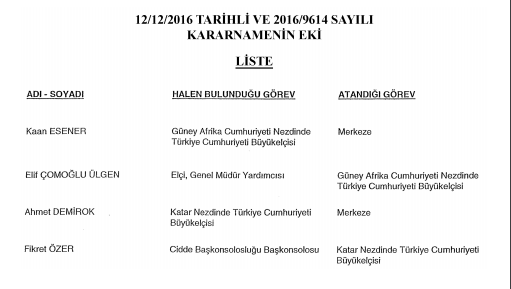 Bugünkü Resmi Gazete'de yayımlanan “Büyükelçi Atamaları Hakkında Karara” göre, Güney Afrika Cumhuriyeti Büyükelçisi Kaan Esener ve Katar Büyükelçisi Ahmet Demirok merkeze alınırken; Güney Afrika Cumhuriyeti Büyükelçiliği görevine Elif Çomoğlu Ülgen, Katar Büyükelçiliği’ne ise Fikret Özer atandı.