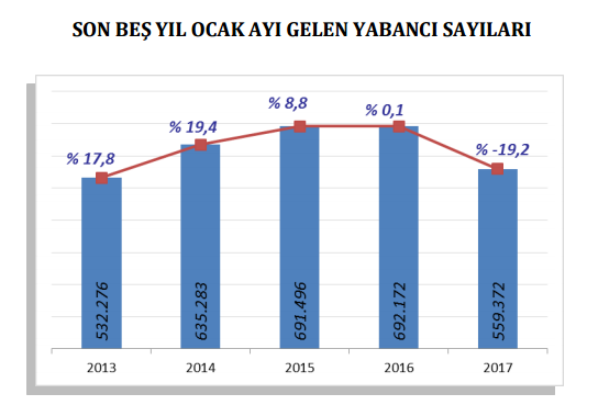 İstanbul İl Kültür ve Turizm Müdürlüğü’nün açıkladığı verilere göre 2017 yılının ilk ayında İstanbul’a gelen ziyaretçi sayısı bir önceki yılın aynı ayına göre % 19.2 oranında azalarak 559 bin 372 seviyesine geriledi. 2016 yılının Ocak ayında İstanbul’a gelen turist sayısı 692.172 seviyesindeydi.