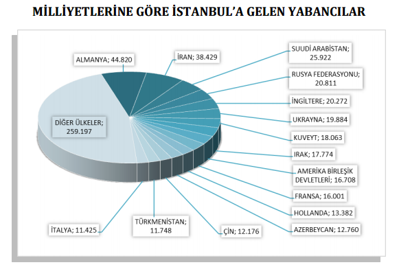 Almanlar: % 8, İranlılar: % 6.9, Suudi Arabistanlılar: % 4.6, Ruslar: % 3.7, İngilizler: % 3.6, Ukraynalılar: % 3.6, Kuveytliler: % 3.2, Iraklılar: % 3.2, Amerikalılar: % 3, Fransızlar: % 2.9, Hollandalılar: % 2.4, Azerbaycanlılar: % 2.3, Çinliler % 2.2, Türkmenler: % 2.1, İtalyanlar: % 2, Diğer ülkeler: 46.3