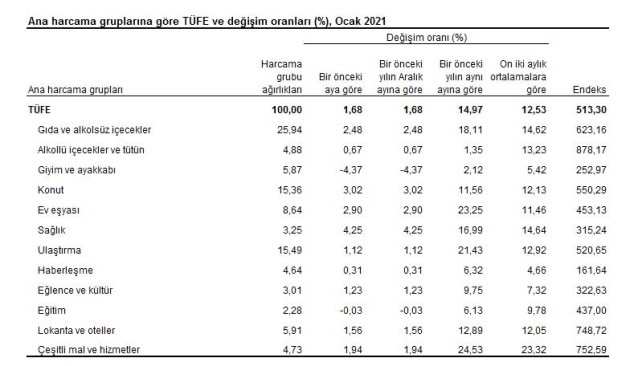 Tüketici fiyat Endeksi'nde (TÜFE) 2021 yılı Ocak ayında bir önceki aya göre %1,68, bir önceki yılın Aralık ayına göre %1,68, bir önceki yılın aynı ayına göre %14,97 ve on iki aylık ortalamalara göre %12,53 artış gerçekleşti.