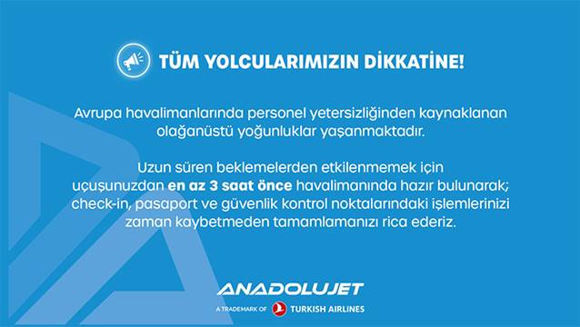 HaberlerEklenme Tarihi: 21.07.2022 13:00 Yolcularına 'Avrupa' uyarısı yaptı Türk Hava Yolları'nın alt markası AnadoluJet yolcularına Avrupa uyarısı yaptı. 0 Forbes Travel Guide 2026’da Türkiye’den hangi oteller listeye girdi? Türk Hava Yolları'nın alt markası AnadoluJet, Avrupa havalimanlarında personel eksikliğinden dolayı yaşanan olağanüstü yoğunluk nedeniyle yolcularını uyardı. Yapılan açıklamada uçuştan 3 saat önce havalimanında olunması gerektiği vurgulandı. Turizm Avrupa AnadoluJet turizm haberleri Yorum yapmak için tıklayın Yorum Yap 0/500 Yorum yazma kurallarını okudum ve kabul ediyorum. Yorum Gönder Yorumlar (0) Daha fazla yorum yükle ÇOK OKUNANLAR Bilet Dükkanı'nda işten çıkarmalar başladı 1 Turizm sektörü tekelleşiyor 2 Epstein dosyasında ismi geçen Rixos’tan açıklama geldi: Gerçeği yansıtmıyor, itibar etmeyin 3 2026 yılı güncel Müzekart fiyatları 4 Elite World, TIF 2026’da franchise büyüme modelini dünyaya tanıtacak 5 TÜRSAB’dan seyahat acentacılığı ve tur operatörlüğü eğitimi 6 Hazine arazisine yapılacak 5 yıldızlı otel projesi yeniden ÇED sürecinde 7 Tamince’den Epstein iddialarına yanıt: Talep Dubaili iş insanından geldi! 8 Corendon Airlines, Brand & Sports Summit’te sporda oyunu değiştiren yaklaşımını paylaşta 9 Düzce Merkez’e 4 yıldızlı otel geliyor 0